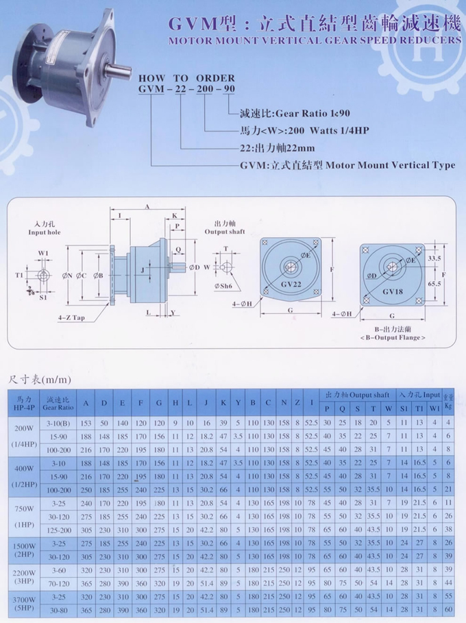 GVM立式齒輪減速電機的型號表示方式,GVM立式小齒輪減速機馬達的外形尺寸表,GVM18,GVM22,GVM28,GVM32,GVM40,GVM50;75W(1/10HP),100W(1/8HP),200W(1/4HP),400W(1/2HP),750W(1HP),1500W(2HP),2200W(3HP),3700W(5HP)