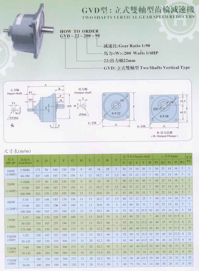 GVD立式齒輪減速電機的型號表示方式,GVD立式小齒輪減速機馬達的外形尺寸表,GVD18,GVD22,GVD28,GVD32,GVD40,GVD50;75W(1/10HP),100W(1/8HP),200W(1/4HP),400W(1/2HP),750W(1HP),1500W(2HP),2200W(3HP),3700W(5HP)