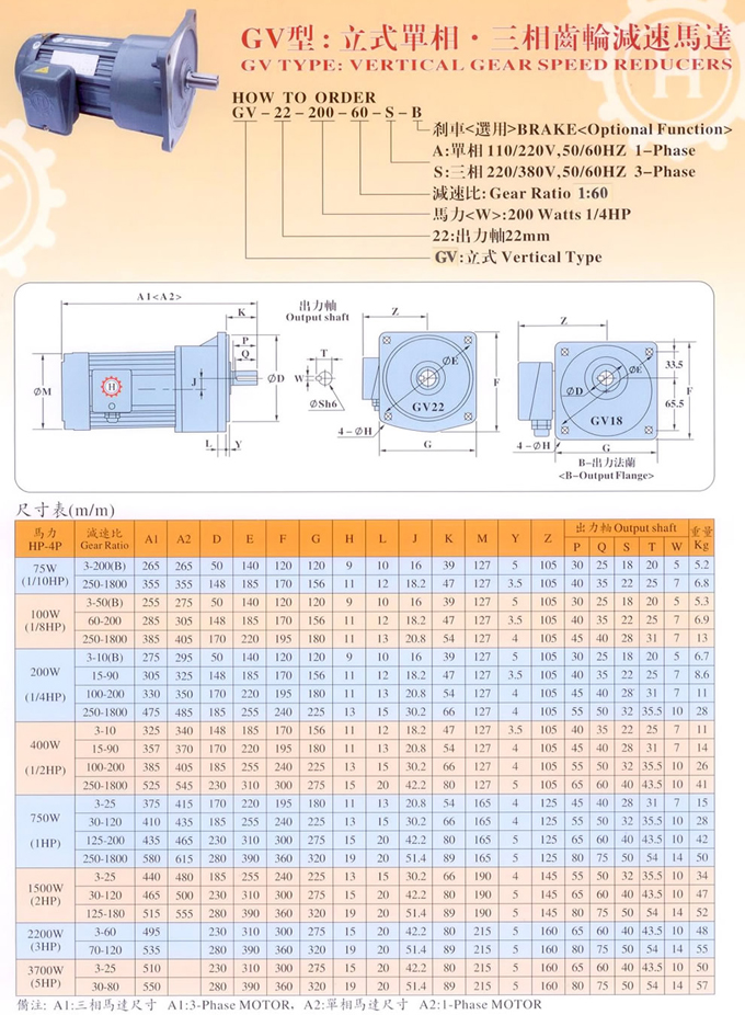 GV立式齒輪減速電機的型號表示方式,GV立式小齒輪減速機馬達(dá)的外形尺寸表,具體型號:GV18,GV22,GV28,GV32,GV40,GV50;可配電機功率:75W(1/10HP),100W(1/8HP),200W(1/4HP),400W(1/2HP),750W(1HP),1500W(2HP),2200W(3HP),3700W(5HP)